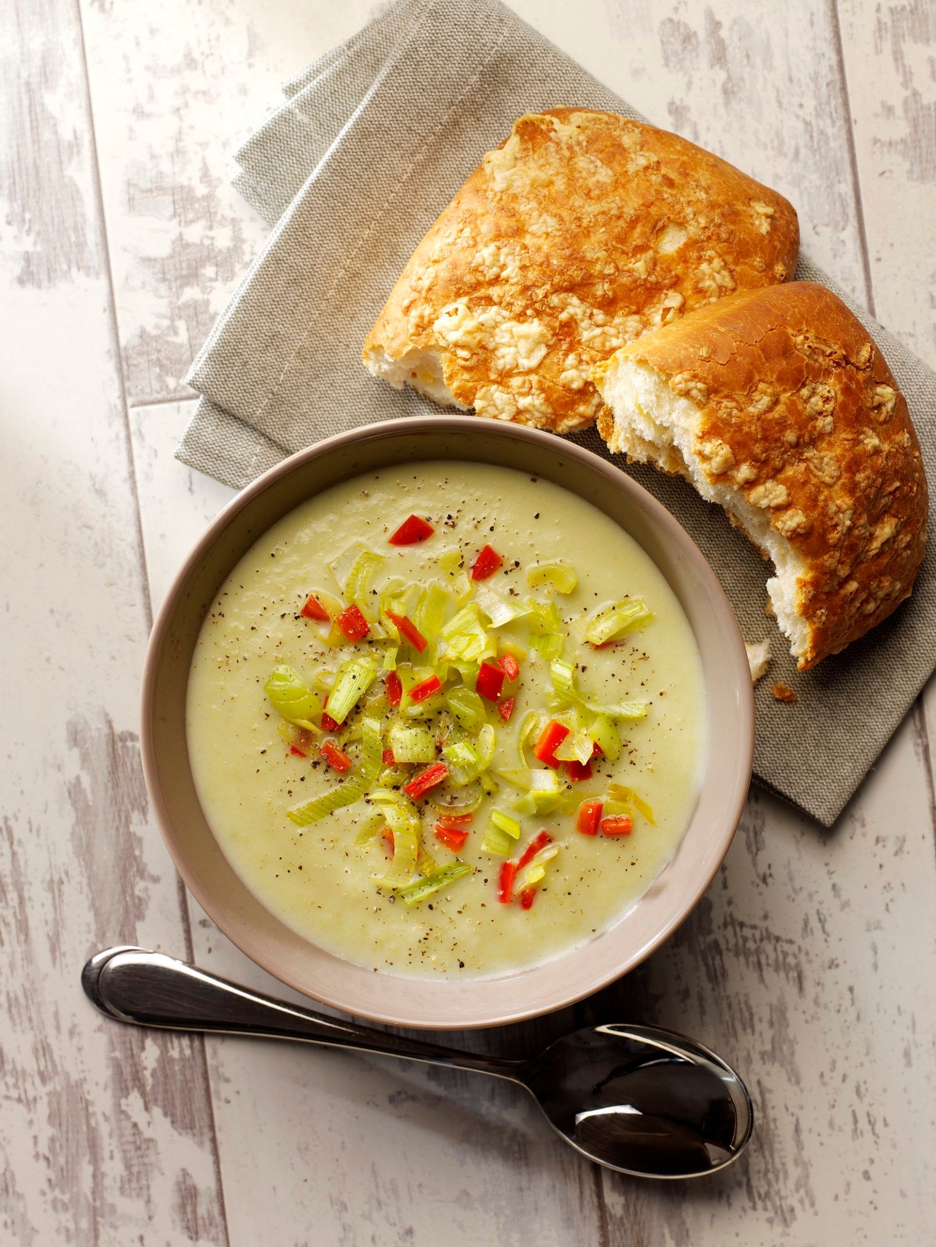 Leek & Cauliflower Soup with Lemongrass Author: www.britishleeks.co.uk Serves: 4 This soup is a wonderfully contemporary take on the classic leek and potato soup. Replacing the potato with the cauliflower reduces the carbs, but keeps it just as creamy. The lemongrass adds the most incredible fresh zingy taste. This soup is stunning served warm and spicy or can be served chilled in the summer. Ingredients 1 medium onion – finely chopped 3 leeks – washed and trimmed and chopped, reserve handful for garnish 1 medium cauliflower – roughly chopped 1 stick of lemongrass – snapped in three places but still together Handful of fresh or frozen peas 500 ml veg stock 150 ml coconut milk Large nob of margarine Olive oil A pinch of salt and pepper to taste Instructions In a large pan, gently heat a large knob margarine and a little drizzle of olive oil, add your onion and let them sweat a little until they begin to turn translucent, then throw in your leeks and cauliflower and stir. Add the lemongrass, turn the heat down to the lowest, place the lid on and let the vegetables sweat for at least 5 mins until they are soft, then add the peas and pour in the stock and coconut milk. Let it bubble gently for another 10 minutes then turn off the heat and let it cool a little. Remove the stick of lemongrass before whizzing up with a stick blender, if necessary add more stock or coconut milk to reach desired consistency. Finely cut a small red chilli and a little leek to garnish and serve. 3.5.3208