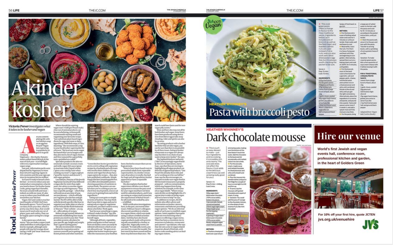 In a double-page spread on veganism, the Jewish Chronicle this week explores what it takes to be kosher and vegan: ‘Are you contemplating life without lokshen soup or an egg-less Pesach? Veganism is growing in popularity, so you’re in good company. Veganuary — the charity that promotes a plant-based lifestyle at the start of each year— is in full flight with every supermarket touting a vegan range.’ Read the full story here.