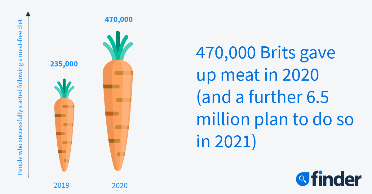 The number of those who gave up meat in 2020 was double that of 2019’s figures People following veganism increased by 40% in 2020 12% of the population intend to become vegetarian, vegan or pescatarian in 2021 As 2021’s Veganuary begins, annual diet intentions research from the shopping comparison site, finder.com , reveals that 470,000 Brits successfully started following a meat-free diet in 2020. This is an increase of 100% compared to the numbers who started following a meat-free diet in 2019 (235,000) and takes the total number of Brits who are vegetarian, vegan or pescatarian up to 7.2 million, or 14% of the population. The diet that saw the most new recruits was veganism, which saw a 40% rise in recruits. This means approximately 1.1 million people followed this at the beginning of 2020, but the figure now sits at over 1.5 million people. This is equivalent to 3% of the population. Pescetarianism saw the second biggest rise in followers, with around 300,000 people successfully adopting the diet in 2020. This takes the total number to almost 2.5 million Brits (5%). Interestingly, the number of Vegetarians actually declined by 10%, down to 6% of the population (3.1 million), although some of these people are likely to have switched to vegan and pescatarian diets. 2021 diet intentions: The trend looks set to continue as well, with a staggering 6.5 million people saying they intend to become vegetarian, vegan or pescatarian in 2021, which is equivalent to 12% of the UK’s adults. If everyone were successful with this aim, it would mean that over a quarter of the population (26%) – 13.7 million – would be meat-free by the end of the year. As with previous years , it is the vegetarian diet that is set to have the most new recruits. Almost 2.8 million people (5%) intend to start following this diet in 2021. For the first time though, the vegan diet looks set to be the second most popular diet in the coming year. The numbers planning to do this have doubled from the beginning of 2020, up to 2 million (4%) from 1 million (2%). The number of people planning to become pescatarian have remained static from last year, with 1.7 million saying they take up the diet. Not everyone is managing to stick to their diets. Despite the positive news that 470,00 people adopted meat-free diets in 2020, this is only 9% of all those who said they would in 2020. If this trend continued with the UK’s 2021 diet intentions, it would mean that 580,000 of the 6.5 million new recruits would stick to their new diets. Youngsters leading the meat-free charge. The younger generations are significantly more likely to follow a meat-free diet. Leading the way is gen Z, with a fifth already doing so (20%) and a further 26% planning to adopt one in 2021. Millennials are not far behind, currently 19% follow a meat-free diet and they could be joined by an additional 16% throughout 2021. The silent generation are the least likely to follow a meat-free diet. Only 8% currently avoid meat and/or fish, with 4% aiming to join them throughout the coming year. To see the full research, including breakdowns of which diets are the most popular in the UK, visit: https://www.finder.com/uk/uk- diet-trends Commenting on the growth of the meat-free movement, Stephen Davis of finder.com , who gave up meat for the first time in 2020 said: “I had been thinking about giving up meat for a while but the catalyst came when I watched Game Changers on Netflix early last year. Like many others I was surprised by what it showed and felt compelled to stop eating animal produce. I have mainly stuck to a vegan diet since giving up meat and there has been a noticeable improvement to my health – I also managed to lose a bit of weight.”