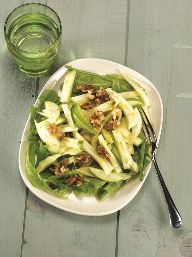 Recipe taken from The Adventurous Vegetarian: Around the World in 30 Meals (£20) by Jane Hughes. Buy the book here . Reproduced with the kind permission of Jane Hughes and New Internationalist. Apple and Fennel Salad with Orange Ginger Cider Vinaigrette Recipe Type : Vegan Author: Jane Hughes Prep time: 15 mins Total time: 15 mins Serves: 2 A stunning salad from the ‘Canada’ chapter of ‘The Adventurous Vegetarian’. Ingredients FOR THE SALAD: 3 oz /90 g rocket 1 bulb fennel, julienned (save leaves for garnish) 1 medium green apple, julienned FOR THE DRESSING: 2 tablespoon apple cider 1 tablespoon rapeseed oil 2 teaspoon maple syrup 1 teaspoon fresh grated ginger 1 clove garlic, crushed (optional) 1 orange, zested and juiced pinch of salt FOR THE GARNISH: ⅓ cup/50 g toasted walnuts (optional) fennel leaves Instructions Make the dressing by whisking all the ingredients together. Put all the salad ingredients into a large serving bowl, toss through the dressing and top with toasted walnuts and fennel leaves. 3.2.1255