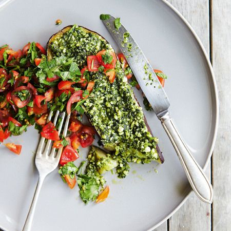 This simple, tasty bake takes no effort whatsoever and is a complete meal, with the cashews adding great protein to this dish. Recipe from Honestly Healthy: Eat With Your Body in Mind, The Alkaline Way by Natasha Corrett and Vicki Edgson. Photography by Lisa Lindner. Published in hardback by Jacqui Small. Available now in full colour eBook format across the Kindle and Apple platforms. Click here to read Natasha Corrett’s ‘My Life as a Vegetarian’ article. Ingredients: For the aubergine with cashew pesto: 1 aubergine, halved lengthways 4 tbsp olive oil 50 g raw cashews 40 g coriander 1 garlic clove 50 g feta / vegan cheese For the sweet tomato tabouleh: 80 g baby vine tomatoes, deseeded, diced and drained 100 g flat-leaf parsley, roughly chopped 30 g raw sesame seeds 2 tbsp olive oil juice of 2 lemons 2 tsp agave syrup Instructions: Preheat the oven to 170C / 340F / gas mark 3.5 Place the aubergine halves cut-side up on a baking tray, drizzle with 2 tablespoons of olive oil and bake for about 25 minutes, until almost tender. Meanwhile, whizz the cashews, coriander, garlic and remaining olive oil in a blender to a rough paste. When the aubergine halves are almost tender, coat them with the pesto and return to the oven for a further 10 minutes, until the pesto starts to crisp and brown. Serve sprinkled with cheese and accompanied with this Sweet Tomato Tabbouleh… Place the diced tomatoes in a bowl and stir in the parsley and sesame seeds. Whisk together the remaining ingredients and drizzle onto the tomato mixture and toss together. 3.2.1311