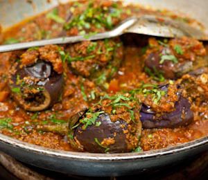 Recipe by Ajoy Joshi, founder and chef of the highly acclaimed restaurant Nilgiri’s in Sydney, Australia. Recipe reproduced with the kind permission of Ajoy Joshi. Bharleli Vangi (Stuffed Aubergine) Recipe Type : Vegan Author: Ajoy Joshi Prep time: 20 mins Cook time: 35 mins Total time: 55 mins Serves: 2 as part of an Indian meal Here is my version of a dish called ‘Stuffed Eggplant’ that the French call ‘Aubergines Farces’ and the Italians ‘Melanzane Ripieni alla Calabrese’. My dish is called ‘Bharleli Vangi’ which hails from the coastal region of Maharashtra in Western India. I assure you that once you make this, and your friends eat it, the other two will become history! Believe you me. This dish can be made with baby cucumbers or baby courgettes instead of the baby eggplants. Trust me, cook it for a meat-eating friend who thinks vegan food is for rabbits. They will be amazed. Anah Daata Sukhi Bhava! (Let the food giver lead a happy life.) Ingredients 6 baby eggplants 6 tablespoons vegetable oil 1 tablespoon ginger paste 1 teaspoon turmeric 1 tablespoon chili powder 2½ tablespoons vegetable garam masala 1½ cups desiccated coconut 1 teaspoon salt ½ cup fresh coriander, chopped 2 cups chopped tomatoes 4 tablespoons water with 1 tablespoon salt, or 4 tablespoons vegetable stock 1 teaspoon lemon juice Instructions TO PREPARE THE EGGPLANTS: Add 1 tablespoon salt to 1/2 litre of tepid water in a large bowl to immerse the deseeded eggplant. Slice top off the eggplant. Score the diameter of the circle using the tip of a sharp knife. Scoop out the eggplant seeds (the scored circle will prevent the eggplant skin from tearing). Scoop out the seeds until you can insert the teaspoon one inch into the eggplant’s length (in total, remove about 1 teaspoonful from each eggplant). Place the scooped eggplants into the bowl of saltwater you prepared earlier – this will reduce the bitterness of the eggplant and prevent any discolouring of the inside. TO MAKE THE SAUCE AND THE FILLING: Heat frying pan, then heat 3 tablespoons of the oil and add ginger paste. Fold until ginger almost caramelised. Reduce heat, add turmeric and fold gently. Add chilli and fold. Fold in garam masala, then add coconut and fold until coconut begins to caramelise. Finally, fold in salt. Remove half the filling and place in small bowl. Leave remaining filling in the pan to make the sauce, later. Add coriander to the bowl and set aside. Return to the eggplants and dry each by using a clean tea-towel. With a small spoon, scoop up some of the filling and insert into each eggplant. Press down the filling firmly with the teaspoon. Once stuffed, set aside the eggplant and repeat for each remaining eggplant. Meanwhile, in a clean frying pan, heat remaining oil until it starts to smoke. Add stuffed eggplants, one at a time, and cook until skin is crisp. Cover pan and slow cook until inside of eggplants are cooked. Remove from heat and set aside. TO PREPARE THE SAUCE: Heat pan with remaining filling and fold in tomatoes. Cook until tomatoes are soft (add any remaining filling to pan). Add water, or stock, and bring to the boil. Reduce heat and cook until sauce has thickened. Place a banana leaf on a plate. Place sauce on the banana leaf. Stand the eggplants in the sauce. Add remaining sauce on top of the eggplants. Add 1/2 teaspoon lemon juice to bring out the aroma of the dish. Serve with a chappati or bread of your choice. 3.2.1230 To see a step by step version of this recipe with images, check out Ajoy’s blog – An eggplant (aubergine) dish that’s fit for a vegan king! Nilgiri’s, 81 Christie Street, St Leonards, NSW, Australia 02 9966 0636 www.nilgiris.com.au