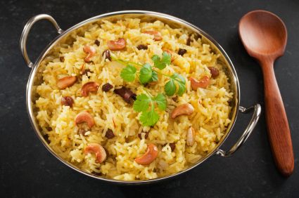 Prep time: 5 mins Cook time: 30 mins Total time: 35 mins Serves: 3-4 Full of subtle flavours, this is the kind of rice dish you’d expect at a top Indian restaurant. Best served with lentil dal and fresh salad. Ingredients: 2 tablespoons oil 1 onion or 4 shallots, finely chopped 1 teaspoon ground cumin 1 teaspoon ground coriander ½ teaspoon chilli powder 5 cardamom pods 2 cm stick of cinnamon ¾ teaspoon ground mace 2 cloves of garlic, crushed 250 g basmati rice 600 ml vegetable stock salt, to taste 60 g roasted cashew nuts handful of fresh coriander Instructions Heat the oil in a large pan and add the onion or shallots. Cook for 5 minutes, stirring so as not to brown the onions. Add the ground cumin, ground coriander, ground mace, chilli powder, cardamom pods and cinnamon stick and cook for 2 minutes, making sure they don’t burn. Add the rice and garlic and cook on a low heat for 5 minutes, stirring continuously. Add the vegetable stock and some salt then cover and simmer on a low heat for 15 minutes, stirring occasionally. Take off the heat for a 5 minutes until the rice is tender and the stock has been absorbed. If it still appears too moist, return the pan and cook on a low heat for a further few minutes. Transfer to a serving dish and top with the cashew nuts and fresh coriander leaves. 3.2.1230