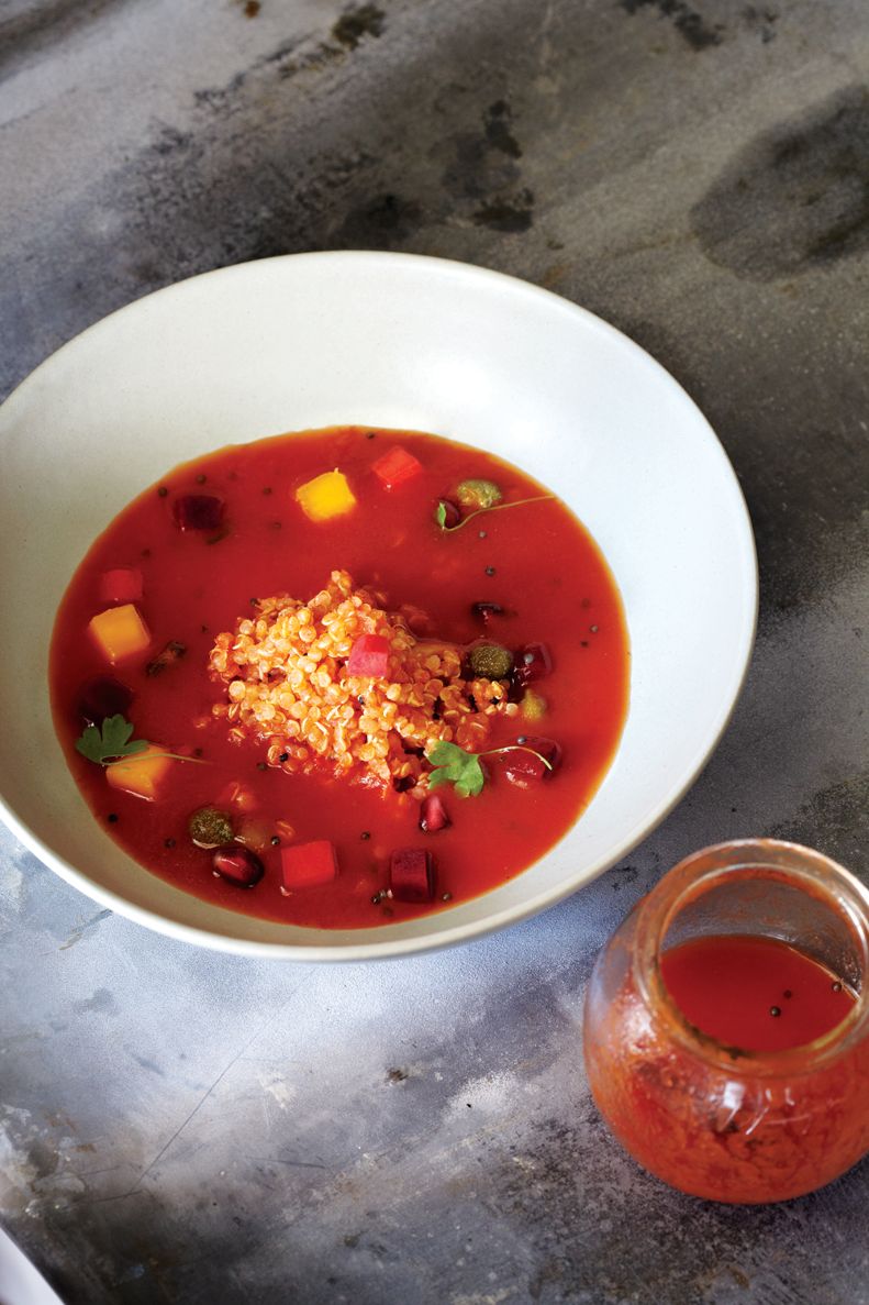 Recipe taken from Cinnamon Kitchen The Cookbook (£25) by Vivek Singh. Buy the book here . Reproduced with the kind permission of Vivek Singh. Chilled Green Mango and Tomato Soup Recipe Type : Vegan Author: Vivek Singh Prep time: 15 mins Cook time: 3 hours 30 mins Total time: 3 hours 45 mins Serves: 4-6 Ingredients 10 ripe tomatoes, quartered 5 green mangoes 5 red peppers, deseeded and roughly chopped 5 cm piece of fresh ginger, peeled and roughly chopped 5 garlic cloves, peeled 1 teaspoon cumin seeds, roasted 1 teaspoon red chilli powder 3 tablespoons extra-virgin olive oil, plus extra for drizzling 1 teaspoon salt 1/2 teaspoon sugar 250 ml water salad leaves or micro cress leaves, to garnish Instructions Mix together all the ingredients, except the water, in a non-metallic bowl and leave aside to marinate for about 3 hours. Add the water, transfer to a blender or food processor and blend until smooth. Strain the soup into a bowl, pressing down on the vegetables, to extract as much flavour as possible. Cover and refrigerate until chilled. Pour the tomato soup into the bowls and drizzle with more olive oil just before serving. Garnish with salad leaves or micro cress 3.1.09