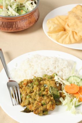 Creamy Vegetable Korma Recipe Type : Vegan Prep time: 15 mins Cook time: 25 mins Total time: 40 mins Serves: 4 Korma is a type of curry originating from South Asia. The dish is usually creamy, and this can be achieved through using yoghurt, nut/seed pastes, cream, coconut milk or creamed coconut. This recipe opts for creamed coconut. Ingredients 3 tablespoons sunflower or rapeseed oil pinch of mustard seeds pinch of garam masala pinch of ground coriander 1 onion, peeled and diced 1/2 green chilli, seeded and chopped 1 clove fresh garlic, peeled and chopped a small piece of fresh ginger (approx 6 cm/2 inches in length), peeled and grated 600 g mixed vegetables such as carrots, cauliflower, broccoli and courgette, peeled and chopped 3 medium potatoes, parboiled and chopped 1/2 teaspoon cumin powder 1 tablespoon creamed coconut salt and pepper, to taste Instructions Heat the oil in a large frying pan over a medium/low heat. To check the oil is hot enough, add a few mustard seeds – if they pop, the oil is ready. Then add the remainder of the mustard seeds and the onion. Fry these for 3 minutes, and then add the chilli, garlic and ginger and fry for a minute or two. Add the garam masala, salt, cumin and coriander powder to the frying mixture for a further minute. Add the carrots and cook for 5 minutes, then add the cauliflower. After another 2 minutes add the courgettes and broccoli. Stir-fry for another 5 minutes. Mix in the coconut with 400 ml of hot water. Cover with a lid and simmer on very low heat for about 5 minutes or until the sauce is fairly thick and medium brown in colour. Serve with chappatis or rice and a green salad. 3.1.09