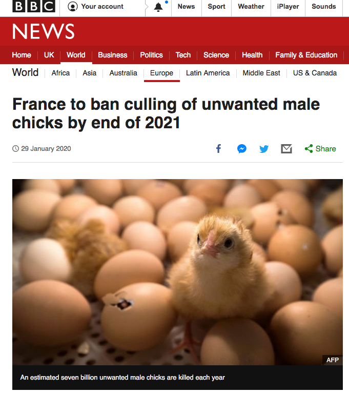 France has pledged to outlaw the practice of culling unwanted male chicks by the end of 2021, as part of animal welfare reforms. About seven billion male chicks – not wanted for meat or eggs – are killed around the world each year, usually in shredding machines or by gas. The government said new methods were emerging that would make it possible to test the sex of embryos inside the egg. But some campaigners said the reforms did not go far enough. Click here for the full story on the BBC.