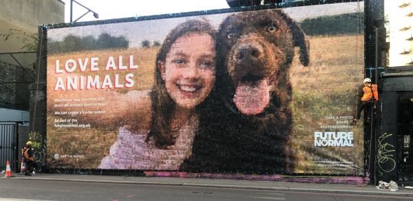 As part of the Future Normal campaign, the Vegan Society’s first ever billboard was unveiled on Sunday 18 April on Holywell Lane in Shoreditch, London. The huge mosaic of a dog and their carer is made up of thousands of images of formerly-farmed animals now living peacefully in sanctuaries. Watch the billboard go up in this time-lapse video . It is a powerful image that we hope will encourage people to reconsider what the “future normal” in a post-pandemic world looks like, especially in how we view and treat non-human animals. It is the first billboard in the UK to use Kavalan PVC-free vinyl, a sustainable and environmentally-friendly material, which was sourced specifically for the campaign. If you are in the area or have friends and family nearby, we would love you to visit the billboard and take some photographs, sharing them using #FutureNormal . If you are not local, you can still follow @ourfuturenormal on social media to like or share our billboard posts, helping us to spread the message of a kinder world for all animals.