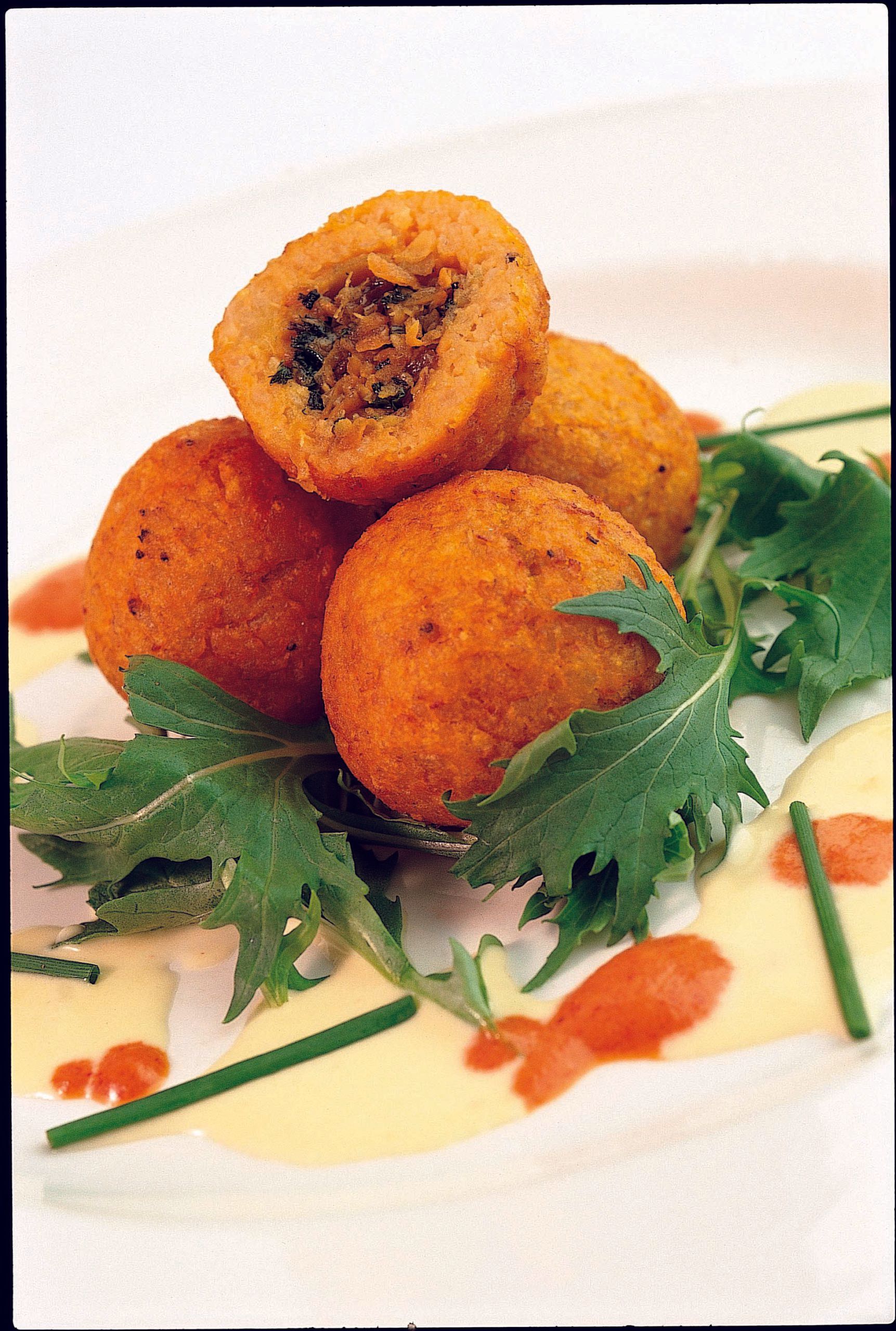 Recipe courtesy of The Gate Restaurant , one of London’s most successful vegetarian restaurants since 1989. Green Banana (Plantain) Fritters Author: The Gate Restaurant Serves: 4 This is a dish inspired by a trip to India – a Gate classic and customer favourite. Ingredients FOR THE FRITTERS: 3-4 small plantains 300 g sweet potato (preferably orange-fleshed) Vegetable oil for deep-frying Salad greens for serving For the stuffing: 2 tablespoons sultanas or dates 1 tablespoon each of olive oil and vegetable oil 1 large red chilli, seeded and finally chopped 3 garlic cloves, finely chopped 5 cm (2 inches) fresh root ginger, grated 5-6 shallots or 2 banana shallots, finely chopped 1 small carrot, grated 2 teaspoons sugar Juice of 1 lime 2 tablespoons toasted pine nuts Handful each of mint and coriander leaves, chopped FOR THE SWEET CREAM CHILLI SAUCE Touch of olive oil 1 large red chilli, seeded and finely chopped 2 small shallots, finely chopped ½ garlic clove, finely chopped 1 tablespoon granulated sugar 1 tablespoon mirin (Japanese sweet rice wine) 250 ml (9 fl oz) double cream / soya cream Instructions Well ahead, make the stuffing. Soak the sultanas in warm water for 10 minutes, then drain and roughly chop. Heat the oils in a large frying pan or wok and cook the chilli for 30 seconds, then stir in the garlic, ginger and shallots and cook gently for about 5-10 minutes. Add the carrots and cook for 6-7 minutes more, until this is soft. (If the mixture catches, stir in a few drops of water; don’t worry as a little charring adds to the flavour.) Stir in the sugar until dissolved, then stir in the lime juice, pine nuts, sultanas or date and herbs. Leave to sit for 3-4 hours to let the flavours develop. To make the fritters, preheat the oven to 220°C/425°F/gas mark 7 and roast the plantains and sweet potato in their skins for about 30 minutes, until the plantain skins split and the flesh inside has darkened. When cool enough to handle, remove the skins from the plantains and rinse then while still warm as this helps them mash more easily. Peel off the sweet potato skin, Mash the vegetables together. Mix thoroughly. Roll the mixture into 12-16 ping-pong size balls. There are two ways of stuffing the fritters; either push a thumb deep into a ball and pile the stuffing into the hole, then push in the edges around the hole to seal it; or make them by flattening the ball out, placing a spoonful of the stuffing in the centre, folding the mixture around the stuffing and rolling it back into a sealed ball. The second method will allow space for more stuffing mixture. Chill the fritters for at least 30 minutes. For the sauce, heat the oil in a small frying pan and sauté the chilli briefly, then add the shallots and garlic and sauté for 1-2 minutes more. Stir in sugar, mirin and cream, bring to just below the boil, still stirring, and take off heat. Sieve and keep warm. To cook the fritters; heat 3 cm of vegetable oil in a wok or large frying pan until almost smoking and cook the fritters in two to three batches, turning them so they cook evenly, for 2-3 minutes until golden. Remove with a slotted spoon and drain on kitchen paper. Keep warm while you cook the rest in the same way. To serve, arrange three to four fritters in the middle of each plate on green salad leaves, pour the cream sauce around, speckle the plate with chilli coulis and scatter over some chive stalks. 3.2.1255