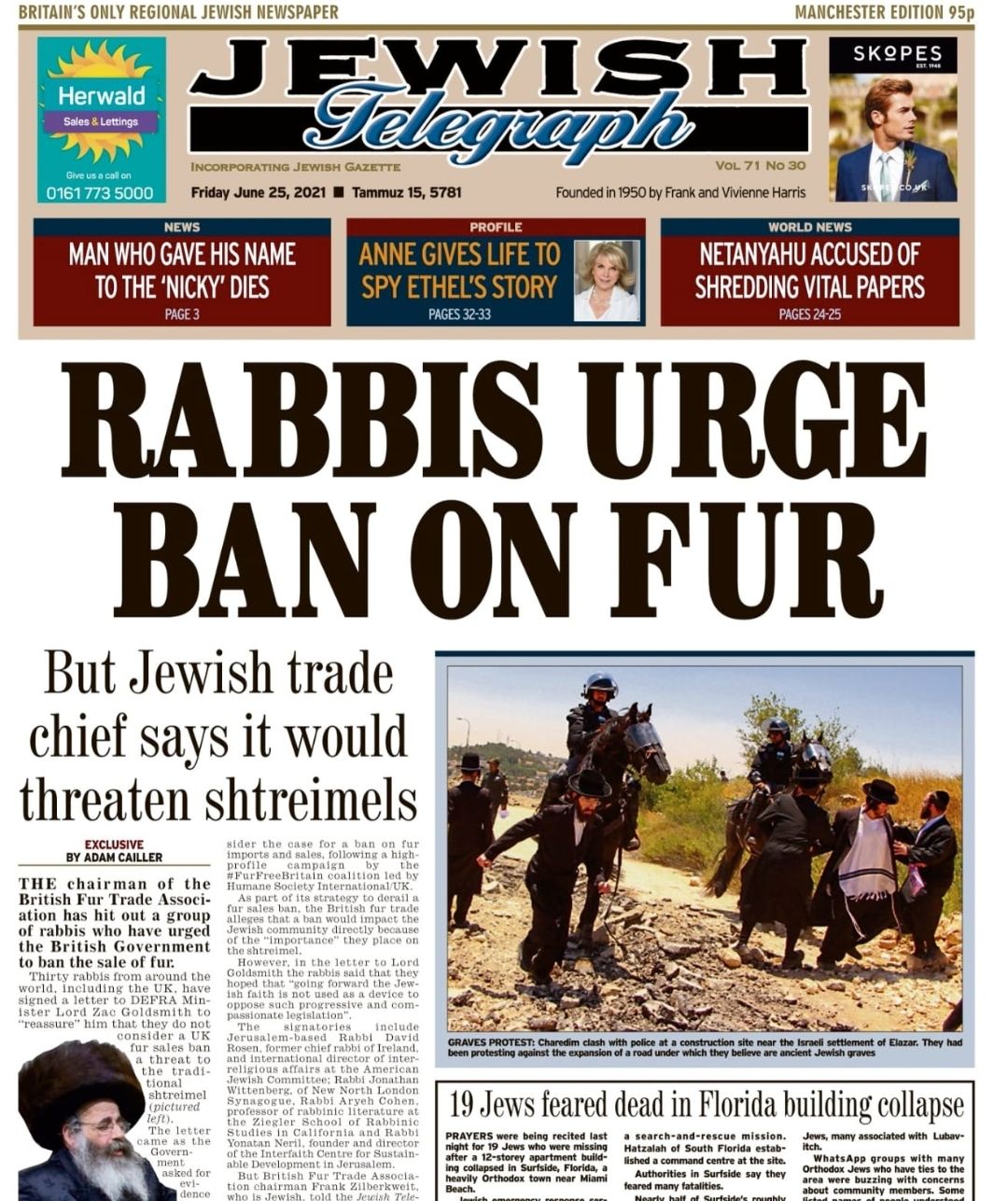 You may have read about a proposed ban of fur in this week’s Jewish Chronicle or seen it on the front page of the Jewish Telegraph. Here at JVS we helped to contact rabbis around the world to invite them to support the ban, resulting in dozens of leading UK and world rabbis backing calls for a UK ban on fur sales. ‘UK signatories include two JVS Patrons, Rabbi David Rosen and Senior Masorti Rabbi Jonathan Wittenberg and Liberal Judaism chief executive Rabbi Charley Baginski.’ `We are pleased to see so much Rabbinic support for an end to fur sales in the UK – the production of which is wholly at odds with sacred Jewish teachings’ writes our director Lara Balsam. ‘The fur trade is responsible for the suffering and death of more than 100 million animals each year, including fox, chinchilla, mink, raccoon dogs and rabbits. Most of this fur is produced by intensively farming animals in battery-cage systems in countries such as Poland, Finland, France, Norway and China. The fur trade claims that welfare is high, and even funds accreditation schemes in an attempt to give the trade a veneer of respectability. But countless investigations on fur farms all over the world reveal the harrowing and disturbing truth. This is what fur farms really look like ,’ writes Humane Society International UK.
