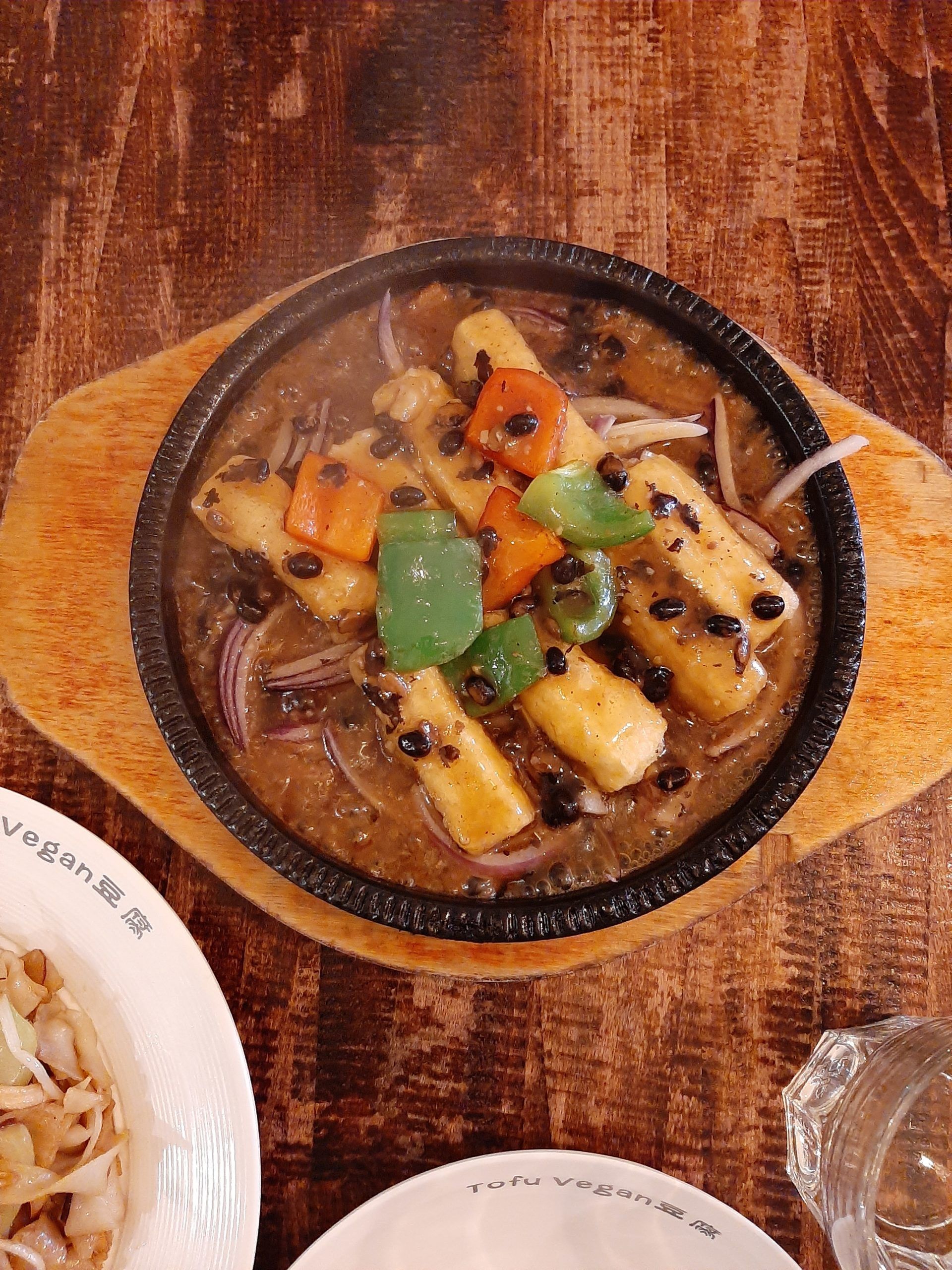 On an especially rainy and chilly February day, I was excited to try some warming Chinese fare at Tofu Vegan in Golders Green. One of five branches scattered across London, their NW11 site is a stone’s throw from JVS, conveniently located opposite the old Hippodrome and is well serviced by numerous buses as well as the Northern Line. The concept is 100% vegan, no preservatives, all freshly handmade daily. Arriving at 12.45pm I almost had the place to myself but for a couple on an adjoining table. I have heard it gets very busy in the evening and booking is advised. It was a very cold day and generally there weren’t many people out and about. It got busier after 1pm with tables filling up. Stepping inside from the main road I was pleasantly surprised by the serene ambiance and how quiet it was inside. The vibe is very relaxed with soft lighting and gentle background music. I was greeted by smiley staff and seated in a really cosy banquette. There’s a decent-sized menu to choose from, which has allergens – gluten, nuts, celery, peanuts, sesame and mustard – clearly marked. As a coeliac I found the separate, ample gluten free menu very handy and was reassured by the manager’s explanation that for customers with an allergy a fresh wok and new oil is used, plus dishes come out with allergen flags in. Each dish also has a chilli rating so you know what to expect! The manager told me that their best seller is the Wontons in a house special sauce (£7.90), his personal favourite is the Stir-fried ‘lamm’ with cumin and chilli (£13.80). We had a chat about the clientele, I was curious to know how many of their customers are vegan. ‘Around 50-60%, and the rest are either people doing Veganuary, trying to be vegan a few times a week or simply looking for good food. having heard positive things about the restaurant.’ He said he has noticed that the vegan customers tend to opt for the vegetable dishes whilst the meat substitutes are more popular amongst the non-vegans. This branch had very steep steps up to the toilets, which might mean you want to visit a different branch with better accessibility. You can also find Tofu Vegan in Islington, Spitalfields, Fitzrovia, and South Kensington. Worth noting they are closed on Mondays at their NW11 restaurant, and they close between lunch and dinner service too. My food, the Sizzling fried tofu in black bean sauce (£13.80), Stir-fried ho-fun rice noodles with mixed vegetables (£9.80) and Smacked cucumber salad with a spicy, garlicky sesame dressing (£8.20) was served in an impressive eight minutes. If you want to try a few dishes but can’t finish it all, they are happy to bag up leftovers, which I appreciated. I remembered at the end of the meal that the drink I had ordered never arrived. I really enjoyed all the dishes, they were authentic, moreish, flavoursome, well seasoned and I could really taste the care and attention that had been put into each dish. I found portions were on the small side and prices were high relative to other vegan restaurants and to other Chinese places. That being said, the freshness and quality of ingredients did shine through. The couple next to me loved their meal – dim sum, lotus root, vegetable rolls, and dumplings. Everything that came out of the kitchen looked and smelled irresistible. I would love to try it again with friends as there are lots of dishes I had my eye on. There are also desserts I didn’t get to, priced at either £4.80 and £5.80, which all look delicious.