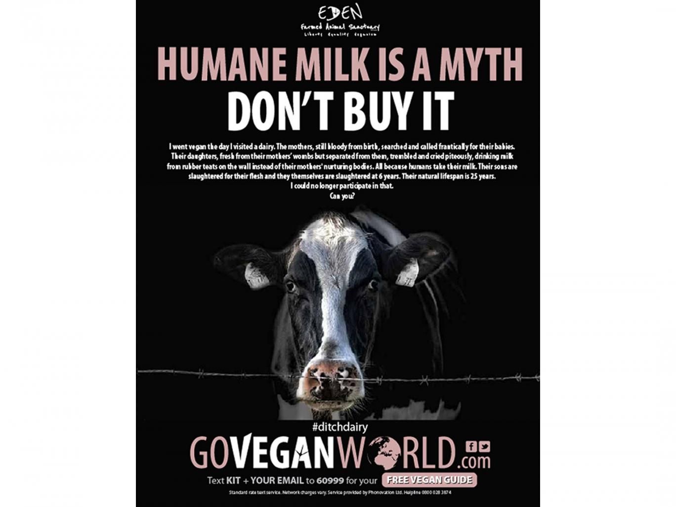 Advertising Standards Authority gives green light to Go Vegan World newspaper ad despite dairy industry outcry. An ad stating that “Humane milk is a myth” has been cleared by the regulator following complaints from members of the dairy industry that it was inaccurate and misleading. The national newspaper ad for Go Vegan World, a vegan campaign group , in February featured a photo of a cow behind a piece of barbed wire and the headline “Humane milk is a myth. Don’t buy it.” Smaller text stated: “I went vegan the day I visited a dairy. The mothers, still bloody from birth, searched and called frantically for their babies. Click here to read the full story in the Independent, written by Josie Clark.