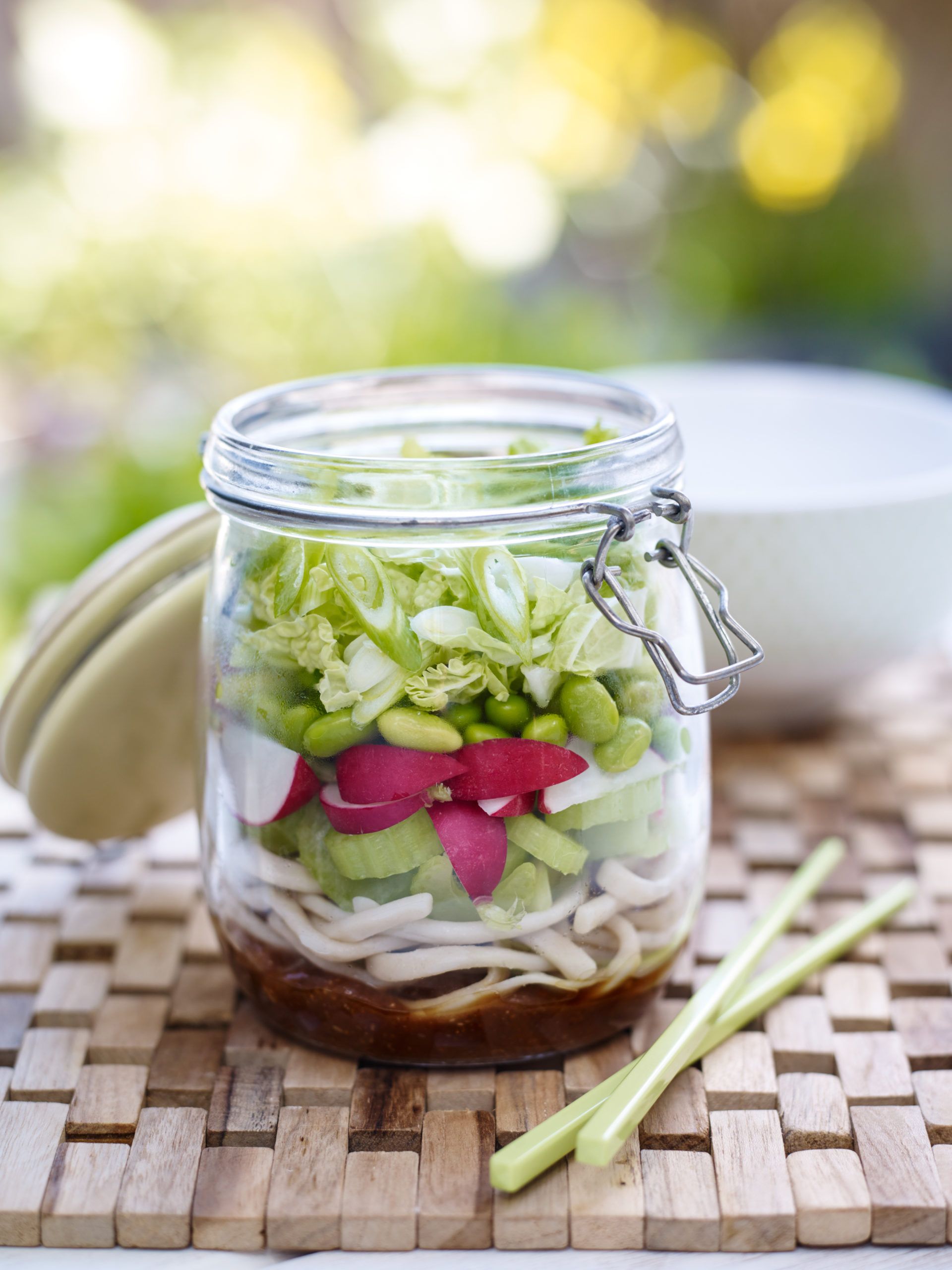 Pam Lloyd PR Love The Crunch (15th April 2015) Noodle Salad – from Love the Crunch Recipe Type : Salad Author: lovethecrunch.co.uk Prep time: 10 mins Total time: 10 mins Serves: 1 This tasty Asian inspired salad packs a real crunch thanks to the celery, radishes, spring onions and Chinese leaf lettuce. Make it up the night before for a quick, easy and delicious lunch on the go. Ingredients FOR THE DRESSING: 1 tbsp peanut butter 2 tsp soy sauce 2 tsp Sesame oil ½ tsp chilli flakes 1 tsp rice wine vinegar Water FOR THE SALAD: Large handful of frozen soya beans 100g fresh egg or udon noodles 1 stick of celery, sliced 4 radishes, sliced into wedges 1 spring onion, sliced 3 slices of Chinese leaf lettuce, finely shredded Instructions In a bowl whisk all the dressing ingredients with a splash of water until smooth. Pour into the bottom of the jar. Defrost the soya beans in boiling water then drain. Layer the noodles on top of the dressing, then the celery and radish, then soya beans and top with the crunchy spring onions and Chinese leaf lettuce. To serve, tip everything into a bowl and give a good stir. Chef’s tip: Soya beans can be found in the freezer section of most supermarkets. The key to jar salads is the order they are put into the jar. Put the dressing in the bottom and then layer firmer vegetables at the bottom, the protein in the middle and the leafy greens at the top so they don’t get wet. 3.3.3077