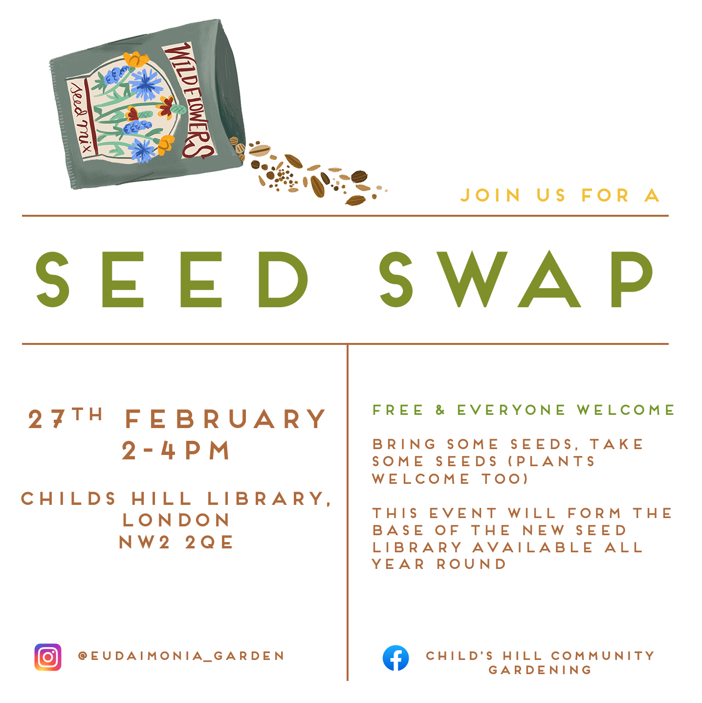 On the 27th Feb 2-4pm at Childs Hill Library , NW2 2QE local resident Fran Welch is organising a free Seed Swap . ‘We’ll be swapping seeds (plants welcome too), stories and talking plans for the community Everyone is welcome (even if you don’t have any seeds to bring)!’ This inaugural seed swap also marks the start of the free Seed Library in Childs Hill; this new seed bank will enable locals to take a few seed varieties each year for free to grow in the local community/gardens/allotments and give tips on how to save seeds to donate some back to the library. This project will encourage and educate children and adults to grow more flowers, vegetables and the importance of saving seeds in fighting disease and growing the healthiest plants possible. This seed library forms part of a wider network of similar London-wide operations such as the London Freedom Seed Bank , who offer free seeds and take donations from London residents.
