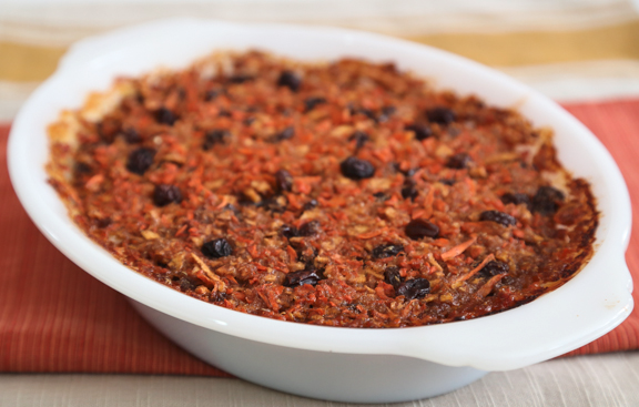 Recipe by Nava Atlas from Veg Kitchen, follow Nava @Veg_Kitchen Passover Carrot-Apple Pudding Recipe Type : Dessert Cuisine: Festival Author: Nava Atlas Serves: Serves 6-8 This sweet side dish of spiced carrots and apples brightens the Passover dinner plate. Baked until crusty, it’s also yummy enough to be an everyday dessert with a dollop of coconut yogurt. Ingredients 1/3 cup quinoa flakes 5 large carrots, grated 2 medium apples, peeled, cored, and grated 1/3 cup raisins 2 tablespoons safflower or other neutral vegetable oil 1/4 cup sweet Passover wine (or substitute pomegranate juice, or similar no-sugar dark red juice) 1/4 cup natural granulated sugar 1 teaspoon cinnamon 1/2 teaspoon ground ginger 1/4 teaspoon ground allspice or nutmeg Instructions Preheat the oven to 350º F. Combine the quinoa flakes with 2/3 cup boiling water in a heatproof bowl. Let stand while the other ingredients are being prepared. Combine all the ingredients in a mixing bowl. Pour in the quinoa flakes and mix well. Pour into an oiled 9- by 5- by 3-inch loaf pan. Cover and bake for 40 minutes. Uncover and bake another 30 to 40 minutes, or until the top is nicely browned and crusty. Let cool. Slice and serve warm or at room temperature. 3.5.3208