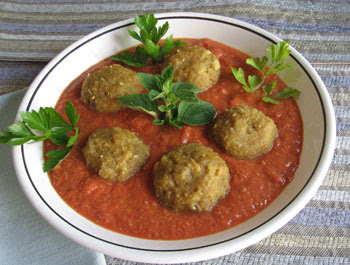 Recipe by Zel Allen, from Veg Paradise Pesach: Sweet Potato Dumplings in Tomato Brazil Nut Sauce Recipe Type : Main Dish Cuisine: Festival Author: Zel Allen Serves: 28 Dumplings Dumplings are a delightful Passover treat. And made with sweet potatoes, they pack sweetness with every tantalizing bite. Add the savory nut-enhanced tomato sauce and the dish becomes especially enticing and highly nutritious. The easiest way to enjoy these delicious dumplings is to prepare them a day or two before serving, place them on a plate, cover with plastic wrap, and refrigerate them. You can even prepare the sauce for them in advance, and refrigerate it in a covered container. Shortly before serving, combine the dumplings and the sauce in a 9 x 13-inch baking dish and warm it at 350 degrees for about 20 minutes. To prepare the dumplings at other times of the year, I prefer to use whole-wheat matzoh flour to make them more nutritious. Ingredients 3 pounds yellow sweet or orange potatoes 1 (1-pound) box matzoh 1 1/2 teaspoons salt 1/2 teaspoon turmeric Tomato Brazil Nut Sauce Yield: 6 to 7 cups 3 cups water 2 (6-ounce) cans tomato paste 1 (28-ounce) can whole tomatoes, coarsely broken with a fork 4 cloves garlic, crushed 2 1/2 teaspoons organic sugar 1 teaspoon fresh lemon juice 3/4 teaspoon salt 1/2 teaspoon dried basil 1/2 teaspoon dried thyme Freshly ground black pepper 1 cup Brazil nuts Instructions Preheat the oven to 450 degrees and line a baking sheet with parchment paper or aluminum foil, shiny side down. Place the sweet potatoes on the baking sheet and bake for 60 to 70 minutes, or until they are softened. While the potatoes are baking, grind the matzoh into flour in the blender in several batches. Fill a 6- to 10-quart stockpot two-thirds full with water, cover, and set aside. When the potatoes are soft, peel them and use a potato masher to mash them in a large mixing bowl. Add the salt, turmeric, and 1 3/4 cups of the matzoh flour to the sweet potatoes and mix well to form a stiff dough. You may find it’s easier to mix the dough with your hands. Save the remaining matzoh flour for other Passover recipes. Bring the stockpot water to a boil over high heat. Spoon out heaping tablespoons of sweet potato dough and roll each one between the palms to form a dumpling about 1 1/2 inches in diameter. When you have formed about 4 or 5 dumplings, carefully lower them into the boiling water with a spoon and boil them for 2 to 3 minutes or until they begin to float to the surface. Use a slotted spoon to remove the cooked dumplings to a dish and repeat the rolling and boiling process with the remainder of the dough. Combine all the ingredients, except the Brazil nuts, in a stockpot and bring to a boil over medium-high heat. Reduce the heat to medium and simmer for 20 to 30 minutes, stirring frequently with a wooden spoon. Reduce the heat, if needed, to avoid burning the sauce. While the sauce is simmering, grind the Brazil nuts to a buttery meal in several batches in a mini chopper/grinder or small electric coffee grinder. Add the nut meal to the sauce and simmer for 5 minutes longer. The sauce will thicken considerably. Thin the sauce with a little water if needed. 3.5.3208