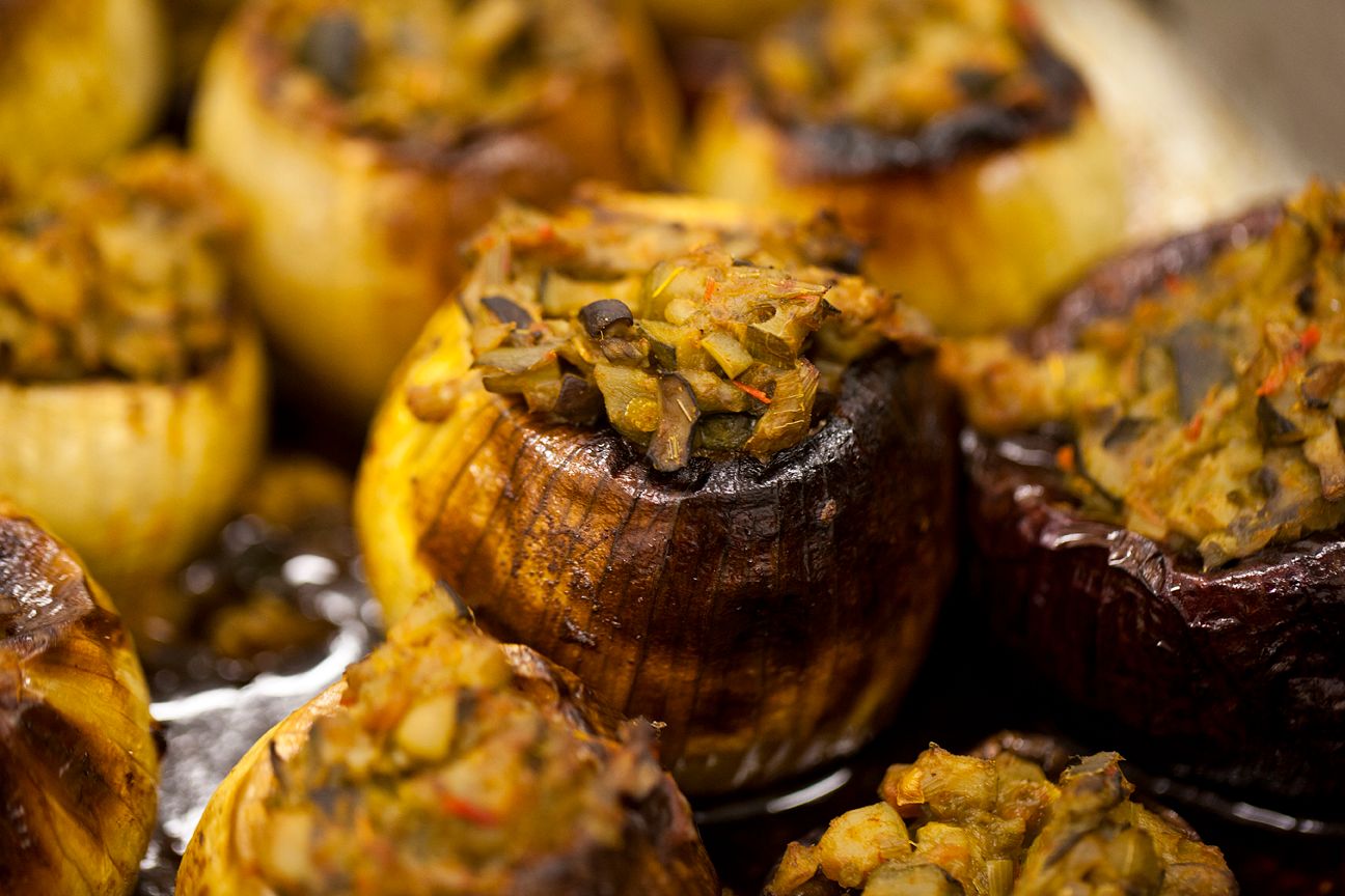 This recipe is courtesy of FoodCycle, a charity working to reduce food waste and food poverty in communities across the UK by serving healthy, meat-free meals for people in need. They collect fresh fruit and veg that would otherwise be thrown away and cook these ingredients into nutritious three-course meals. Find out more at www.foodcycle.org.uk and get involved! Roasted Stuffed Onions with Roasted Garlic and Red Pepper Purée Recipe Type : Vegan option Author: FoodCycle Prep time: 20 mins Cook time: 40 mins Total time: 1 hour Serves: 6 What to do with a glut of onions? Well, why not try this recipe, as cooked using surplus ingredients at a FoodCycle pop up restaurant fundraiser by the team from Pie in the Sky Community Café. Ingredients FOR THE ONIONS AND STUFFING: 6 medium/large onions (red, yellow, white, or sweet) 1 medium sized courgette 2 leeks 250 g mushrooms (any kind – chestnut, button, field) 50 g fresh parsley 2 teaspoon smoked paprika salt and pepper, to taste 4 cloves of garlic 50 g butter olive oil handful of black onion seeds 200 g strong cheese – we recommend Stilton. Vegan cheese may also be used. FOR THE PURÉE: 5-6 red/orange/yellow bell peppers 1 whole bulb of garlic olive oil salt and pepper, to taste Instructions FOR THE ONIONS: Chop the ends of the onions off, making sure to take off as little as possible and remove the skin of the onions, making sure that the outer layers of the onion remain intact. Using a small knife, begin to carve out the inner layers of the onions – be sure to leave the outer 1-2 layers untouched. Once you have carved out a bit, use a small spoon to scoop out as much of the centre layers as possible, creating a nice hollow onion shell – make sure to keep one base end untouched. Put all scooped out onion aside (this will be used for the stuffing). Coat a large roasting tin with olive oil and toss the onion shells until they are coated. Neatly place all onion shells with the base end down, on the roasting tin and season with salt, pepper and the smoked paprika. Roast in the oven (approx. 200°C/400°F/gas mark 6) for 20 minutes. At this stage rotate the onions so that all sides get roasted evenly and then dot the roasting tin and the onions with small knobs of butter. Finish roasting onions for another 20 minutes. They will be finished when they are soft to touch, golden brown all around, but still holding their shape. Once done, remove from oven and allow to cool for 3-5 minutes before serving. FOR THE STUFFING: Chop courgettes, leeks and mushrooms into small squares. Dice up the onions you set aside earlier, as small as possible. Mince the garlic cloves. Prepare the parsley for garnish – dice up the stalks and add to the stuffing mix. In a large saucepan, sauté the onions until they are soft then add in the garlic for a few more minutes. Add in the courgettes and leeks and cook for a few minutes. Add in the mushrooms and season with salt, pepper and the smoked paprika. Cook it all down until soft, thick and well combined and remove from the heat. Gently spoon the stuffing into the onion shells, being sure to not tear the onions. Neatly place the stuffed onions back into roasting tray, crumble over the cheese and put into the oven to heat through and allow the cheese to melt. The combination of the roasting juices, butter, and cheese will create a nice gravy at the bottom of the roasting tin – make sure you save this to use when plating up the dish! FOR THE PURÉE: Preheat the oven to 200°C/400°F/gas mark 6. Chop the peppers in half, discarding any seeds inside. Coat a large roasting tin with olive oil and toss the peppers in the oil, so that they are well coated. Season with salt and pepper. Wrap the bulb of garlic in foil and drizzle a small amount of olive oil over the top, season with salt and pepper and place the bulb in the roasting tin with the peppers. Roast for 20 minutes, then turn the peppers over to make sure all sides are roasted evenly. Roast for 20 minutes longer. Remove from the oven and allow to cool slightly before transferring all of the peppers and roasted garlic to a large bowl (to get the garlic out just squeeze the skins). Purée until smooth and then sieve if possible for a nice, silky texture. If the purée is too thick, add some hot water or stock to thin it out. If you sieve the purée, save the mulch that is left over and use it in the stuffing! 3.2.1230