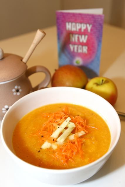 Rosh Hashanah – Carrot and Apple Soup Recipe Type: Vegan option Author: By kind permission of Denise Phillips, Jewish chef and food writer Prep time: 20 mins Cook time: 30 mins Total time: 50 mins Serves: 8 I love to bring spirituality to the table through symbolic recipes and I hope this combination ticks all the boxes with my chosen ingredients. Carrots are one of the significant special foods that we are encouraged to eat. In Yiddish the word for carrots is mehren, which means to increase. So for this reason it is a custom in many communities to eat carrots at the start of the New Year in order to wish for a good and prosperous start. A leek in Hebrew is karti, which means to cut, and at Rosh Hashanah time we wish to symbolically cut down our enemies. Soup is one of the easiest starters for family meals. Carrots, sweetened with apples and a teaspoon of honey provide a delicious warming soup. Note: When soups are puréed, I like to garnish them with the ingredients they are made with. Ingredients 1 kg carrots – ideally organic – peeled and roughly chopped 1 onion – peeled and roughly chopped 2 tablespoons olive oil – for frying 2 leeks – peeled and sliced 3 apples – peeled, cored and roughly chopped 2 teaspoons honey (for a vegan version, use agave syrup) 2 litres vegetable stock Salt and freshly ground black pepper For the garnish 1 carrot, peeled 1 red apple, cored and sliced thinly Instructions Heat a large deep saucepan with the olive oil. Sauté the onion and leeks together until soft but not brown. Add the carrots, honey, apples and stock. Bring to the boil, cover and simmer for 25 minutes or until soft. Transfer to a liquidiser and purée to a smooth consistency. Taste and season. For the garnish, using a paring knife make very thin strips of carrots. Cook in boiling water for 2 minutes, drain and refresh under cold water. Pat dry with absorbent paper. To serve the stylish way: Sprinkle over some carrot spaghetti and strips of apple. 2.2.6 For more delicious recipes, and details of Denise’s cookery classes, please visit the Denise’s Kitchen website . All classes can be tailored for vegetarians. Denise’s Kitchen Tel : 01923 836 456 Email : denise@jewishcookery.com Web : www.jewishcookery.com