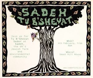 We are delighted to be teaming up with the UK’s first Jewish Farm The Sadeh for a joint Tu B’shevat celebration , with an enchanted indoor forest theme. This is the first event on the farm at Skeet Hill House in Kent: 4 February, 2017 @ 7:45 pm (with an option to stay over night)– 5 February, 2017 @ 11:45 am Tickets available here . The evening will kick off with an inspiring Tu b’shevat seder which is a wonderful kabbalistic tradition and will involve fruit and wine. This will be followed by the Rebbetzin’s disco (by Jacqueline Nicholls), tu b’shevat art activities, apothecary cocktails, snacks, an after party and maybe a bonfire weather dependent! For those who want to stay overnight, the next morning we will have an avodat lev (lots of singing!) session to start the day followed by breakfast and the planting of the first fruit trees on the farm. Invite friends and organise lift sharing on Facebook .
