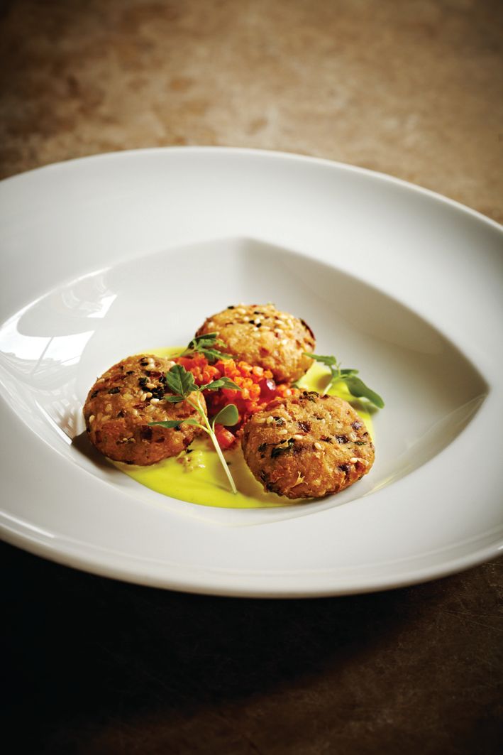 Recipe taken from Cinnamon Kitchen The Cookbook (£25) by Vivek Singh. Buy the book here . Reproduced with the kind permission of Vivek Singh. Spiced Chickpea Cakes with Quinoa Salad Recipe Type : Vegan Author: Vivek Singh Prep time: 20 mins Cook time: 30 mins Total time: 50 mins Serves: 4 These spiced chickpea cakes are inspired by falafel. The list of ingredients may appear daunting, but, once you’ve got them, this is one of the simplest things to make. Quinoa, even though it’s been around for centuries, is not generally used in Indian kitchens, I find it works very well if cooked as you would cook a south Indian upma. Although considered ‘the mother of all grains’ by the Incas, quinoa is not a true grain, but is rich in both fibre and protein, so is a good alternative to wheat for coeliacs and a great substitute for meat protein for vegetarians. Ingredients FOR SERVING/COOKING: oil for deep-frying curried yoghurt, to serve FOR THE SPICED CHICKPEA CAKES: 250 g boiled chickpeas, drained and coarsely blended 2.5 cm piece of fresh ginger, peeled and finely chopped 5 fresh curry leaves, finely shredded 2 green chillies, finely chopped 2 lime leaves, finely shredded 1/2 large red onion, finely chopped 2 tablespoons peanuts, roasted in a dry frying pan and then coarsely crushed 1 tablespoon gram (chickpea) flour 1 tablespoon chopped fresh coriander 2 teaspoons fennel seeds 2 teaspoons salt 1 teaspoon ajowan seeds 1 teaspoon cornflour 1 teaspoon cumin seeds 1 teaspoon sesame seeds 1 teaspoon sugar 1 teaspoon tahini (sesame paste) 1/2 teaspoon black onion seeds juice of 1 lemon FOR THE QUINOA SALAD: 2 teaspoons vegetable oil 1/2 teaspoon black mustard seeds 200 g quinoa, boiled, drained and left to cool 1 green chilli, finely chopped 1/2 large red onion, thinly sliced 1/2 red pepper, thinly sliced 2.5 cm piece of fresh ginger, peeled and finely chopped 1 tablespoon chopped fresh coriander 1 teaspoon salt juice of 1/2 lemon Instructions Firstly, prepare the quinoa salad. Heat the oil in a frying pan to smoking point and add the mustard seeds. When they crackle, remove the pan from the heat and pour the oil and seeds into the quinoa. Add the remaining ingredients, mix together, adjust the seasoning and set aside. Combine all the ingredients for the chickpea cakes. With wet hands, divide the mixture into 12 equal balls (they should each weigh about 30g) and flatten slightly. Heat enough oil for deepfrying in a deep-fat fryer or a deep, heavy-based saucepan to 180°C. Add the chickpea cakes and deep-fry for 1–2 minutes, until crisp and golden brown. Drain well on kitchen paper and serve immediately while still hot with the quinoa salad and curried yoghurt. 3.2.1230 Check out the recipe for Vivek Singh’s accompanying Curried Yoghurt here .