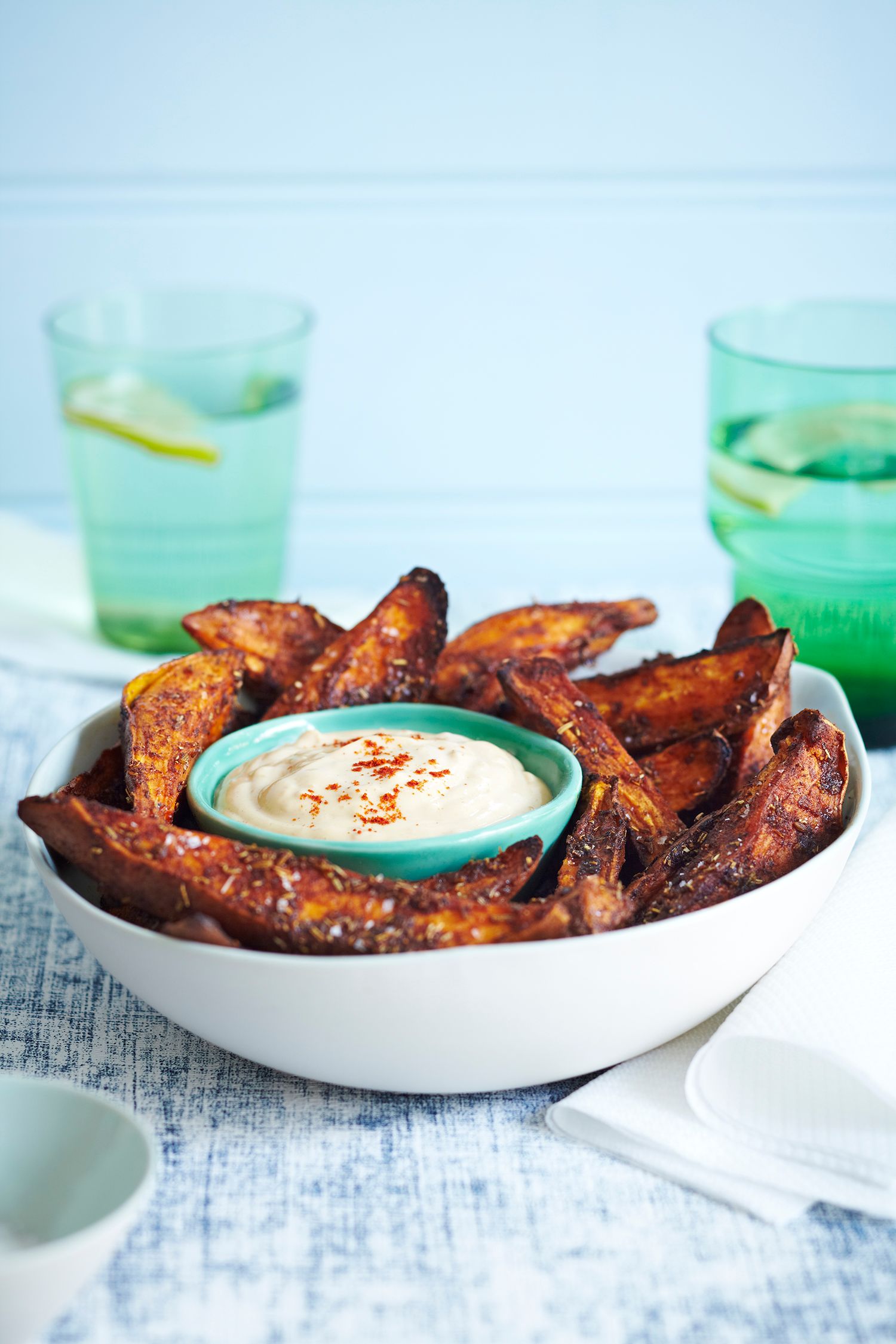 Recipe courtesy of Alpro. Spicy Sweet Potato Chips with Satay Dip Author: Alpro Prep time: 10 mins Cook time: 30 mins Total time: 40 mins Serves: 4 Ingredients 2 sweet potatoes, chopped in to chunky chip slices 1/2 tsp fennel seeds 1/2 tsp cinnamon 1/2 tsp smoke paprika 1/2 tsp dried rosemary 1 tbsp rapeseed oil A pinch of salt SATAY SAUCE: 200g Alpro Simply Plain soya yoghurt Juice of 1/2 a lime 5 tbsp of smooth or crunchy peanut butter 1 tsp agave nectar / maple syrup 1 tbsp soy sauce A pinch of chilli powder Instructions Pre-heat oven to 180 degrees / Gas Mark 4 Add the fennel seeds and dried rosemary to a pestle and mortar, along with a pinch of salt, and grind to a fine powder Sprinkle the smoked paprika and cinnamon into the mixture and drizzle in the rapeseed oil Toss the sweet potatoes in the spiced oil and roast in a pre-heated oven for 25-30 minutes, or until crispy around the edges Add the soya yoghurt to a bowl along with the lime juice, agave nectar, peanut butter, soy sauce and chilli powder. Mix until you have a smooth satay sauce Serve the satay alongside your sweet potato chips as a dip 3.2.2802
