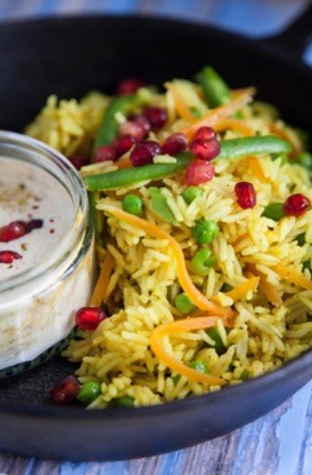 Vegan Biryani with Coyo Dip Recipe Type : Main Dish Author: CoYo This will become a favourite in any vegan’s diet; exciting and colourful this dish tastes as good as it looks. The coconut milk yoghurt dip on the side adds a creamy twist to this spiced dish. Ingredients 300g cooked basmati rice 1 carrot, julienned 200g french beans 200g frozen peas 1 tsp cumin seeds 1 tbsp curry powder 1 clove garlic, minced 1 pomegranate, deseeded ½ tsp ginger paste 1 tbsp curry paste 200g Coyo natural vegan yoghurt Salt and pepper Instructions Make the biryani. Heat 1 tbsp vegetable oil and add the cumin seeds and garlic. After a few minutes, add the carrot, beans, peas, curry powder and cooked rice. Stir fry for 5 minutes and stir through pomegranate seeds before serving. To make the Coyo dip: stir ginger paste, curry paste and seasoning through the natural coyo. Sprinkle with pomegranate seeds and serve alongside the biryani. 3.5.3208