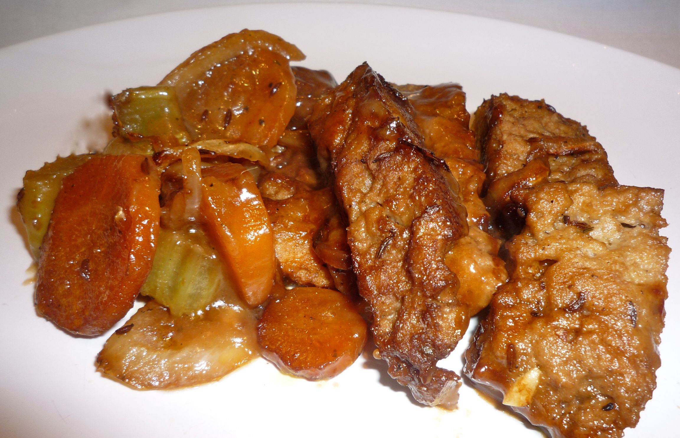 Brisket, traditionally made from beef (indeed brisket is a particular cut of meat), is a popular slow-cooked Jewish festival dish. This vegetarian version is a great alternative as it uses seitan (a soft ‘meaty’ food made from wheat gluten) which soaks up the flavours and juices of the seasoning and gravy. While some people might question why a vegetarian would want to re-create a traditional meat dish – surely vegetarians would want to stay well away from the stuff? – some vegetarians would respond by saying their reason for going vegetarian was not because they didn’t like the taste of meat – they DID like the taste – but they gave it up because of the cruelty, or for environmental or health reasons. In fact, many vegetarians still very much enjoy ‘meaty’ foods, but at the same time, they want to see a kinder world. This is a three-part recipe. First there’s the preparation of the seitan (unless you use ready-made, found in some health food shops), then there’s the cooking of the seitan along with vegetables and seasoning, and finally there’s the gravy. The whole thing takes about 3 hours but much of this is oven-cooking time so it isn’t hard work! Prep time: 1 hour 40 mins Cook time: 1 hour 20 mins Total time: 3 hours Serves: 4-6 INGREDIENTS TO MAKE THE SEITAN (APPROX 440 g – THE AMOUNT REQUIRED FOR THE BRISKET) 120 g wheat gluten aka gluten flour (this can be hard to come by in the UK but online store Flourbin.com stocks it as do some health food shops) 180 ml water (mix with a little vegetable stock for extra flavour) 4 tablespoons soy sauce 1 teaspoon garlic powder 1 litre vegetable stock 3–4 slices of onion INGREDIENTS FOR THE BRISKET AND SEASONING 2 tablespoons olive oil 1/2 tablespoon tamari 2 medium carrots, cut into rounds, 1/4 inch thick 2 celery stalks, chopped roughly 2 medium onions, halved and sliced 440 g seitan 2 small bay leaves 11/2 tablespoons brown sugar 320 ml vegetable stock 200 ml red wine (or grape juice) lots of freshly ground black pepper INGREDIENTS FOR THE GRAVY 3 tablespoons vegan margarine (e.g. Tomor) 2 heaped tablespoons (15 g) plain flour 2 cloves garlic, crushed 2 tablespoons soy sauce 1 1/2 tablespoons miso paste Instructions SEITAN METHOD: (To cut out 1 1/4 hours of preparation time for the brisket, you can make the seitan in advance and freeze it.) Combine the gluten flour and garlic powder in a medium-sized bowl. In a separate bowl, mix 2 tablespoons soy sauce with 180 ml water/vegetable stock. Add the liquid to the dry ingredients and stir gently to combine. After a few initial stirs you may well need to use your hands as the mixture will thicken quickly. Do not use an electrical mixer. Gluten has a rubbery texture. Add more water, a tablespoon at a time – only if required. Once the mixture is well mixed, knead the seitan approximately 15 times. Then allow it to sit for 5 minutes before kneading a few more times. Separate the ball of seitan into about four smaller chunks and gently stretch each one into a flat cutlet, about 2 cm thick. Seitan expands when cooking, so starting with small, thin cutlets is best. Some holes may form but this is normal. Add the four seitan cutlets to a large saucepan containing 1 litre of vegetable stock, and heat to a slow simmer. Add the onion pieces as two more tablespoons of soy sauce and any other favourite spices, to give added flavour. Cover the pan and allow the seitan to cook for about an hour. The seitan is ready once it has firmed up and expanded. Remove the seitan from the broth, allow to cool and use this to make Vegetarian Brisket. Seitan can also be used in a varity of other ‘meaty’ recipes. Seitan keeps well in the freezer in either a sealed plastic box or bag so doubling the recipe is advisable. Allow frozen seitan to defrost for about two hours before use. BRISKET AND SEASONING METHOD: Preheat the oven to 190°C/375°F/gas mark 5. Add the oil, tamari, onions, carrots, celery and bay leaves to a heavy baking dish and mix these around so the vegetables are coated with oil and tamari. Roast for 30 minutes. Meanwhile, combine the vegetable stock, wine (or grape juice) and brown sugar. Remove the dish from oven and lay out the seitan on top of the vegetables. Pour the stock mix over the seitan and vegetables and grind lots of black pepper on top (make sure each piece of seitan is dotted with pepper). Cover the dish with a lid, or tight-fitting aluminum foil, and return it to the oven for 40 minutes. GRAVY METHOD: Remove the brisket dish from the oven, uncover, and pour out as much of the cooking broth as possible into a bowl. Heat the margarine in a small saucepan over a medium heat. Add the flour and whisk constantly for 2-3 minutes. Add the reserved cooking broth, the soy sauce, miso paste and garlic and stir until smooth and thick, (a further 2-3 minutes). Add salt to taste. If there is not sufficient cooking broth left, add some more stock. Put the gravy onto the seitan, stirring to cover all. Raise the oven temperature to its max. Return the dish to the oven and cook, uncovered, until browned and bubbling (approximately 10 minutes). Grind lots more pepper on top, serve hot and enjoy. 3.5.3208