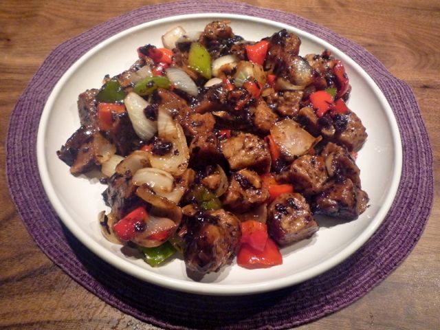 Vegetarian ‘Chicken’ in Chilli and Black Bean Sauce Recipe Type : Vegan Author: Suzanne Barnard Prep time: 20 mins Cook time: 15 mins Total time: 35 mins Serves: 2 Many Chinese restaurants offer vegetarian ‘meaty’ dishes made from seitan (gluten flour) or tofu – ‘lamb’, ‘beef’, ‘chicken’ – if you’re vegetarian it can feel strange ordering these dishes! This Vegetarian ‘Chicken’ in Chilli and Black Bean Sauce is full of flavour and quick to prepare. If you’re using seitan, have a look at the ‘Vegetarian Brisket’ recipe – www.jvs.org.uk/vegetarian-brisket – for instructions on preparing seitan from scratch. Alternatively, tofu or a packet vegetarian ‘chicken’ work well. You will generally only find fermented black beans (douchi) in Chinese grocery stores, so make sure you stock up in advance! Ingredients FOR THE MARINADE: 1 tablespoon rice wine (e.g. saki) 1 teaspoon cornflour FOR THE ‘CHICKEN’: 250 g/8 oz (approx.) seitan, tofu or meat-free ‘chicken’ (e.g. Redwood’s ‘Gourmet Meat Free Chicken Style Pieces’) cut into bite-sized cubes FOR THE SAUCE: 1 tablespoon light soy sauce ½ teaspoon sesame oil a generous sprinkle white pepper 2 tablespoons sugar 4 tablespoons water 2 teaspoons cornflour OTHER INGREDIENTS: 2½ tablespoons sunflower oil 1-inch (2.5 cm) piece fresh ginger, peeled and cut into small pieces 2-3 cloves garlic, finely minced 2 tablespoons fermented black beans (douchi) ½ small green pepper, deseeded and cut into largish pieces ½ small red pepper, deseeded and cut into largish pieces 2 red finger-length chilis, deseeded and cut into thin rounds 1 small onion, cut into largish pieces (or a handful of spring onions, chopped into large pieces) salt, to taste Instructions Marinate the ‘chicken’ with the rice wine and cornflour. Refrigerate for 20 minutes. Prepare the black beans: soak them for 15 minutes, rinse and drain, then squash with the back of a spoon to form a rough paste. Mix all the ingredients for the sauce in a small bowl. Set aside. Heat ½ tablespoon of the oil in a wok or skillet over high heat. Add the ‘chicken’ and stir-fry until the pieces turn golden (approx. 2-3 minutes). Dish out and set aside. Heat the remaining 2 tablespoons oil in a wok over a high heat. Add the garlic and ginger and stir fry until they turn light brown. Stir in the fermented black beans, peppers, onion and red chilli. Stir fry for about 1-2 minutes. Return the ‘chicken’ to the wok, stir and blend well with the other ingredients, about 1 minute. Add the sauce and stir until the ‘chicken’ is cooked through – approx. 5 minutes. Add salt to taste. Transfer to a serving dish then dish up into bowls on top of steamed rice. 3.2.1255