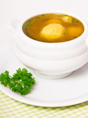 Vegetarian ‘Chicken’ Soup Recipe Type : Vegan Prep time: 15 mins Cook time: 1 hour 30 mins Total time: 1 hour 45 mins Serves: 4 “What on earth is Vegetarian ‘Chicken’ Soup?” you might well ask. It’s a thin soup made from vegetables which serves as an alternative to the traditional version. It’s great for those who once enjoyed Chicken Soup but no longer wish to partake in eating meat. It’s also great for life-long vegetarians who like flavourful soup. The idea is that it is warm and comforting – ‘Jewish penicillin’. The margarine and turmeric in this recipe give the soup its traditional golden colouring, and the bonus factor is that it’s quick and easy to prepare. Ingredients 2 tablespoons vegan margarine (e.g. Tomor) 1 large onion, roughly chopped 1 parsnip, peeled and roughly chopped 2 large carrots, peeled and roughly chopped 2 large celery stalks with leaves, roughly chopped 1 leek, roughly chopped 4 cloves garlic, crushed 2 litres water 2 bay leaves a handful of flat-leaf parsley, roughly chopped 1/2 teaspoon ground cumin a pinch of turmeric 1 tablespoon coarse sea salt flakes (e.g. Maldon) Instructions In a large saucepan, heat the oil and fry the onions for about 5 minutes over a medium heat. Add the carrots, celery, garlic, leeks and parsnip and fry these for a few more minutes. Add the water and bay leaves and bring to the boil. Reduce the heat and let the soup simmer, uncovered, for about an hour. After an hour, add the parsley, salt, cumin and turmeric and simmer for a further half an hour. Using a colander, strain the soup to remove the whole vegetables. Serve hot with kneidlach (for a quick vegan version, Telma’s ‘Kneidl Matzo Ball Mix’ combined with egg replacer works well). 3.2.1230